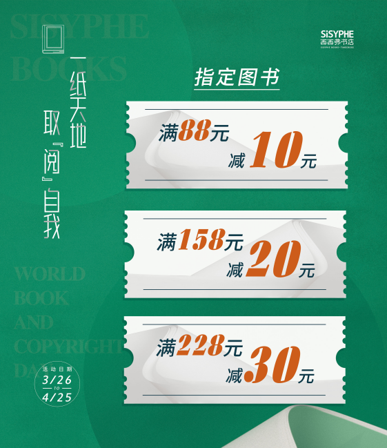 活动期间,凡在书店购买指定图书即享满减福利:满88元立减10元,满158元立减20元,满228元立减30元。