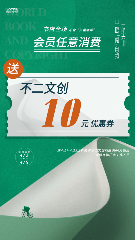 除了图书,不二生活文创也为书友带来了惊喜福利。4月2日-4月5日全场任意消费,即送满66减10元不二文创优惠券(券使用时间:4月17-4月25)