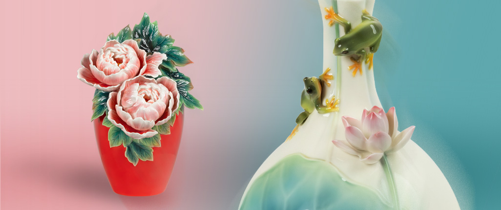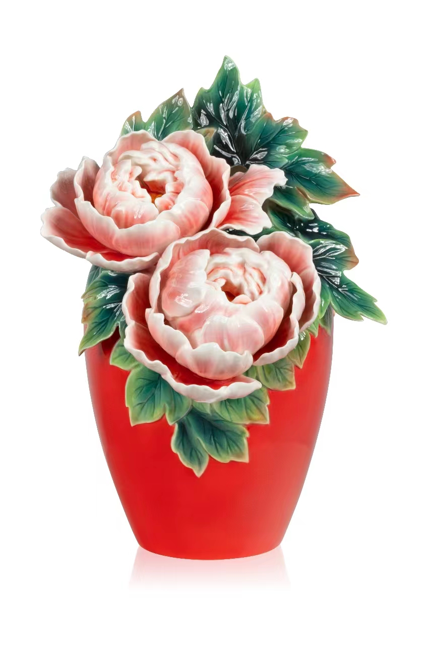连枝牡丹世间少见,常为皇家贵族种植欣赏,更代表好事成双,共结连理。作品以欢喜红瓶身,雕塑生动蓊绿的绿叶,衬托花开富贵,祝福新年气象万千,吉祥富贵。